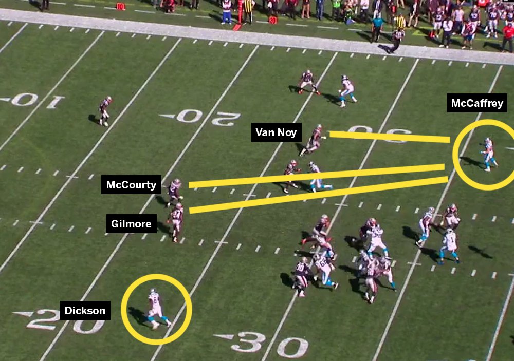 On the Devin Funchess’s touchdown, I am not sure how you can leave a 6’5″ wide receiver who is legit running in motion before the snap wide open in the end zone, but Gilmore and Rowe figured out a way to do it. It looks like Gilmore was covering Dickson on the out route and Gilmore was on Funchess, however when Funchess motioned over to the left on the outside, he believed he handed over the responsibility to Gilmore. Well, they both ended up covering Dickson and left open a wide open touchdown. Not exactly how I imagine Matt Patricia drew it up. Also, if you notice on this play, Christian McCaffrey was wide open right in front of Newton uncovered which also would have been an easy walk-in touchdown. Not great!